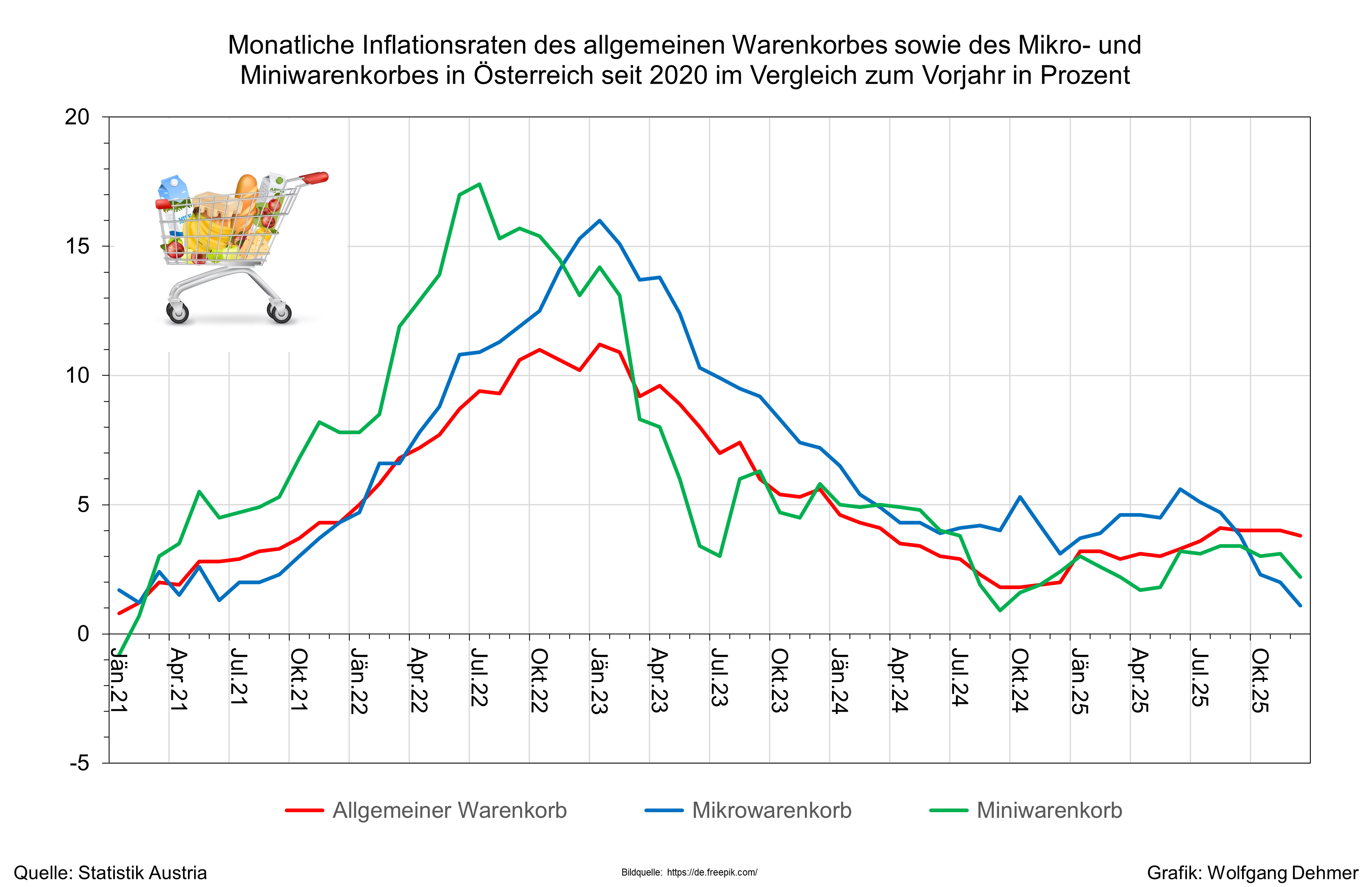 Entwicklung des allgemeinen sowie des Mikro- und Mini-Warenkorbes in Österreich: Inflationsraten seit 2021